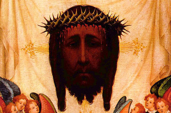 キリストは汗を拭き、ヴェールを彼女へ返します。すると、ヴェールにはキリストの顔が転写されたかのように残りました。このことから、絵画や彫像に〈聖ヴェロニカの聖顔布〉として表現されてきました。また、バチカンのサン・ピエトロ大聖堂の聖ヴェロニカ像の左奥の支柱の中に、その聖顔布が保管されているということです。