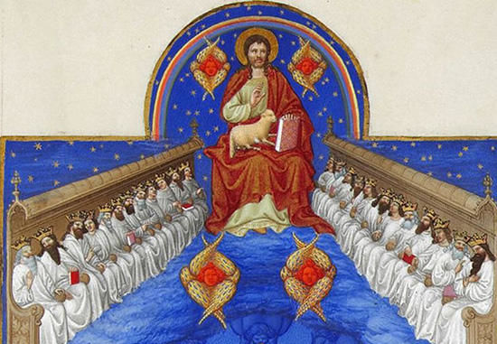 御座の周囲には二十四の座があり、白い衣をまとい金の冠をかぶった二十四人の長老がそこに座していました。御座からはいなずまや雷鳴、さまざまな声が響き渡り、七つのともし火が燃えていました。それらは神の七つの霊だと示されました。