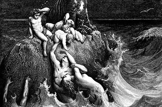 こうして7日の後、洪水が地に起った。それはノアの600歳の2月17日であって、その日に大いなる淵の源は、ことごとく破れ、天の窓が開けて、雨は40日40夜、地に降り注いだ。