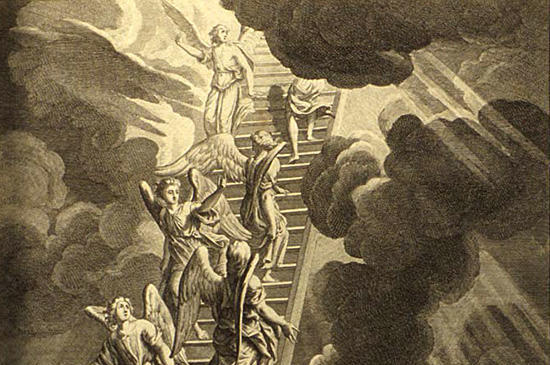時に彼は夢をみた。一つのはしごが地の上に立っていて、その頂は天に達し、神の使たちがそれを上り下りしているのを見た。