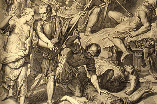 3日目になって彼らが痛みを覚えている時、ヤコブのふたりの子、すなわちデナの兄弟シメオンとレビとは、おのおのつるぎを取って、不意に町を襲い、男子をことごとく殺し、またつるぎの刃にかけてハモルとその子シケムとを殺し、シケムの家からデナを連れ出した。