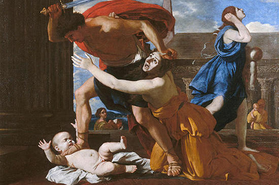 さて、ヘロデは博士たちにだまされたと知って、非常に立腹した。そして人々をつかわし、博士たちから確かめた時に基いて、ベツレヘムとその附近の地方とにいる二歳以下の男の子を、ことごとく殺した。 こうして、預言者エレミヤによって言われたことが、成就したのである。